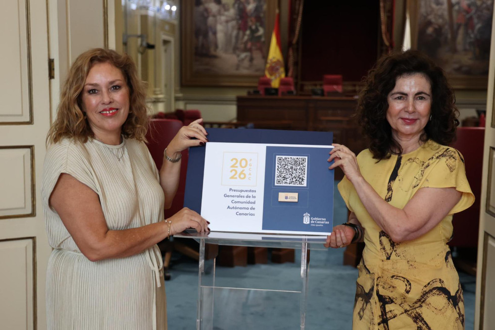 La presidenta del Parlamento de Canarias, Astrid Pérez, recibió este jueves el proyecto de ley de Presupuestos Generales de la Comunidad Autónoma de Canarias para 2026 por parte de la consejera de Hacienda del Gobierno de Canarias, Matilde Asián.