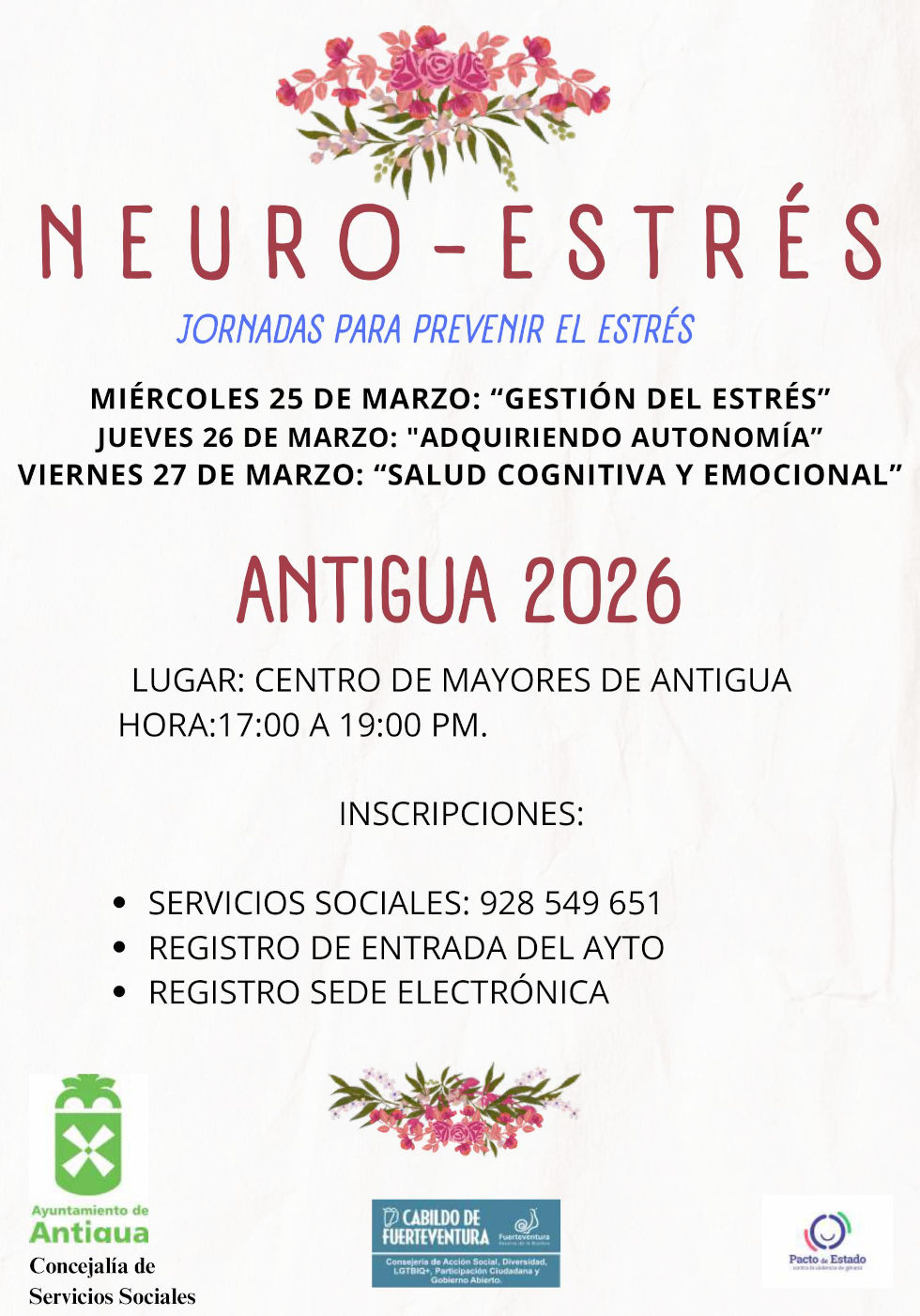 El Ayuntamiento de Antigua desde la concejalía de Servicios Sociales pone freno al estrés organizando unas jornadas preventivas de inscripción gratuita, con la finalidad de adquirir autonomía o seguridad en situaciones complicadas o tensas, gestionar diferentes ambientes y proporcionar herramientas que garanticen la salud cognitiva y emocional de cada persona.