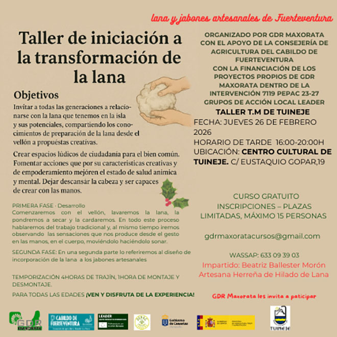 Este taller está dirigido a todas las edades y será impartido por Beatriz Ballester Morón, artesana herreña de hilado de lana. Las sesiones tendrán lugar en Tuineje el 26 de febrero y La Oliva el 27 de febrero en horario de tarde, y en Puerto del Rosario el 28 de febrero en horario de mañana. Las inscripciones y toda la información pueden consultarse en gdrmaxoratacursos@gmail.com o a través del WhatsApp al teléfono 633 09 39 03.