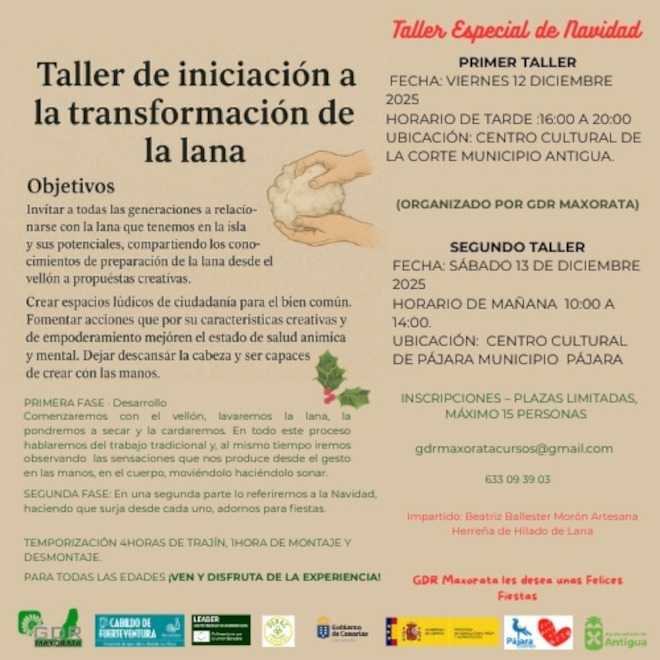 El Cabildo de Fuerteventura, mediante el área de Sector Primario que dirige Matías Peña, y la Asociación para la Gestión del Desarrollo Rural Maxorata organizan el 'Taller de Iniciación a la Transformación de la Lana. Especial de Navidad', una propuesta destinada a todas las edades que invita a descubrir, disfrutar y poner en valor el trabajo artesanal.