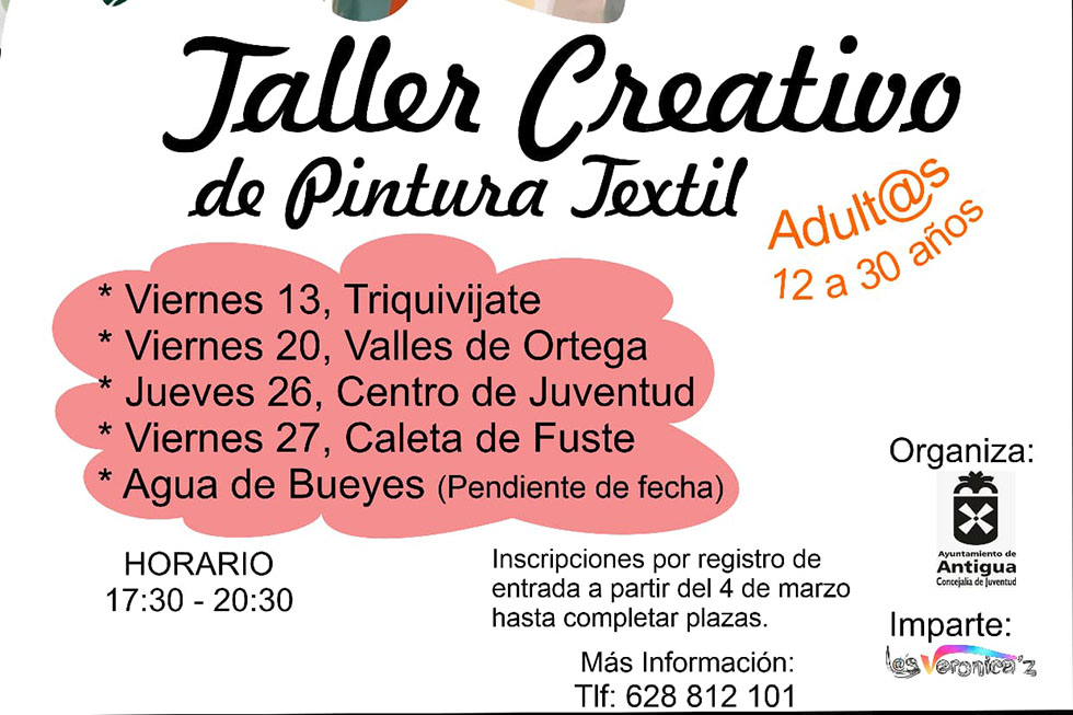 El Ayuntamiento de Antigua desde la concejalía de Juventud organiza el Taller Creativo de Pintura Textil, una propuesta de ocio y formación que recorre todo el municipio “con éxito de participación” y una “magnífica valoración” de las personas participantes, señala el consistorio en un comunicado.
