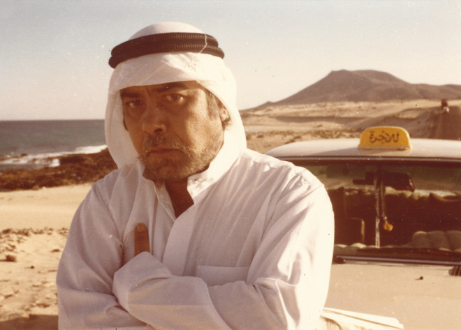 Retrato de Paco Romero durante el rodaje de ‘Mein Freund, der Scheich’ (Mi amigo, el jeque) en las dunas de Corralejo. Romero, natural de Gran Canaria, fue un actor y ayudante de producción habitual en los largometrajes filmados en el Archipiélago durante la década de los setenta. Fotografía cedida por el hijo de Paco Romero y Memoria Digital de Lanzarote.