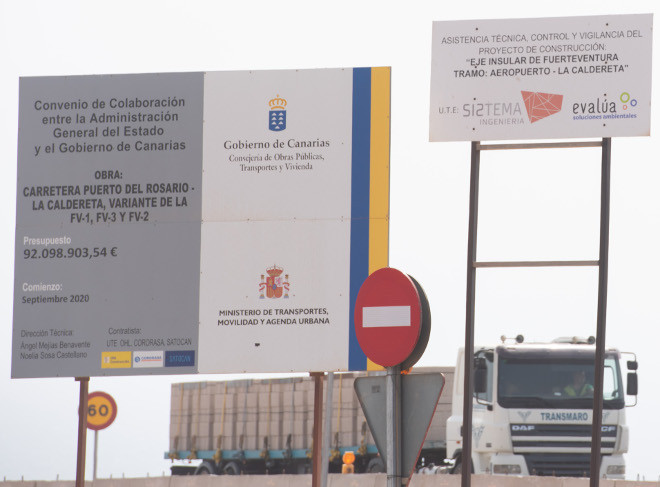 Obra de la nueva autovía con el cartel de la empresa Evalúa.