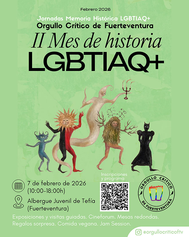 El colectivo Orgullo Crítico de Fuerteventura ha convocado para el próximo sábado 7 de febrero las Jornadas autogestionadas de Memoria Histórica LGBTIAQ+, un encuentro enmarcado en el II Mes de Historia LGBTIAQ+ que tendrá lugar entre las 10:00 y las 18:00 horas en el Albergue Juvenil de Tefía.