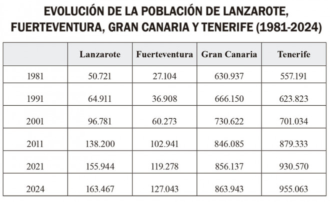 Esta pujanza poblacional de Lanzarote y Fuerteventura es algo novedoso históricamente. Hace 55 años, en 1970, el censo de ambas no sumaba más de 60.000 habitantes (41.146 para la Isla de los volcanes y 18.333 para la Maxorata) y apenas significaban el 5,3 por ciento de la población del Archipiélago. Hay que tener en cuenta que la superficie de ambas islas equivale al 33 por ciento del total del archipiélago. Eran ínsulas especialmente despobladas, sobre todo si las comparamos con las llamadas “islas capitalinas”.