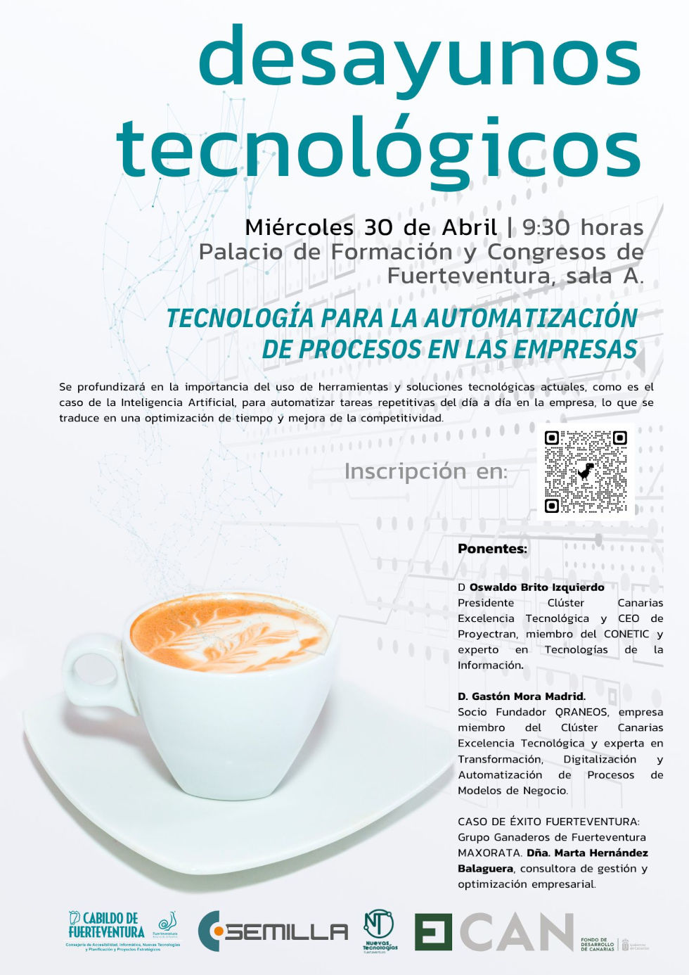 El Cabildo de Fuerteventura ofrecerá una nueva sesión de los Desayunos Tecnológicos centrada, en esta ocasión, en la importancia del uso de la tecnología para la automatización de procesos en las empresas. Tendrá lugar el miércoles, 30 de abril, a las 09.30 horas, en la sala A del Palacio de Formación y Congresos de Fuerteventura.
