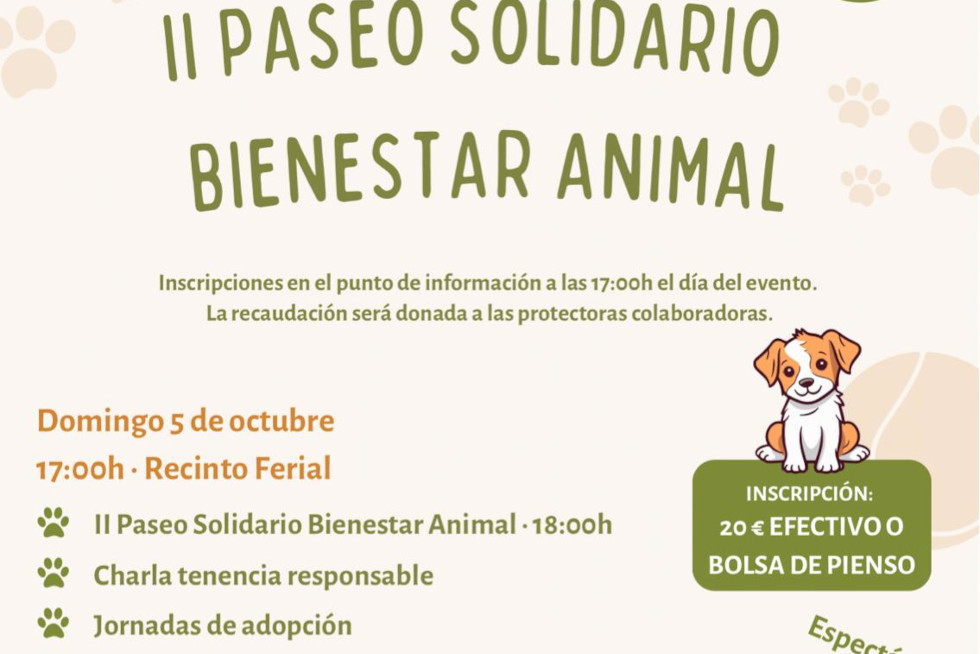 El Ayuntamiento de Puerto del Rosario invita a la ciudadanía a participar en el II Paseo Solidario Bienestar Animal, que tendrá lugar el próximo domingo, 5 de octubre, a partir de las 17:00 horas, en el Recinto Ferial. Se trata de una jornada festiva y solidaria, dirigida a todas las familias y amantes de los animales, en la que se combinarán concienciación, adopción y diversión.