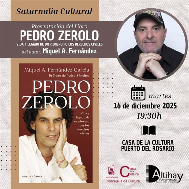 La Casa de la Cultura de Puerto del Rosario acoge este martes, a las 19:30 horas, la presentación del libro ‘Pedro Zerolo: Vida y legado de un pionero por los derechos civiles’, del autor Miquel A. Fernández, en un acto enmarcado en la programación de “Saturnalia Cultural”, impulsada por la Concejalía de Cultura del Ayuntamiento de Puerto del Rosario.
