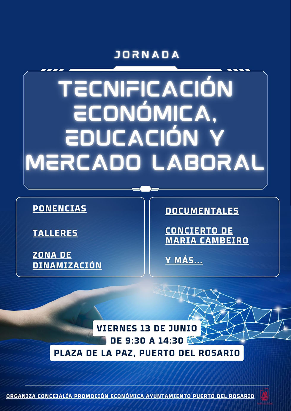 La Plaza de la Paz de Puerto del Rosario acogerá el próximo viernes 13 de junio, en horario de 9:30 a 14:30 horas, la Jornada de Tecnificación Económica, Educación y Mercado Laboral, un evento organizado por la Concejalía de Promoción Económica del Ayuntamiento de Puerto del Rosario con el objetivo de fomentar el diálogo entre educación, innovación tecnológica y mercado laboral.