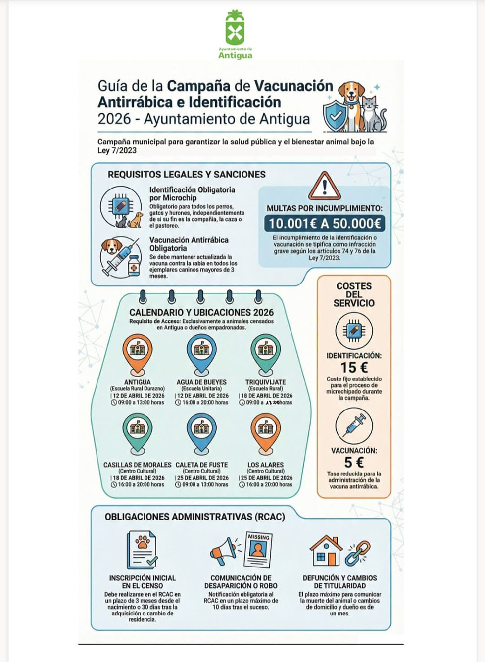 El Ayuntamiento de Antigua, a través de la concejalía de Sanidad, continúa este sábado 18 de abril con la Campaña Municipal de Vacunación Antirrábica e Identificación 2026, tras su inicio en Antigua y Agua de Bueyes, continúa este sábado por la mañana de 09.00 a 13.00 horas en Triquivijate y por la tarde de 16.00 a 20.00 horas en Casillas de Morales.