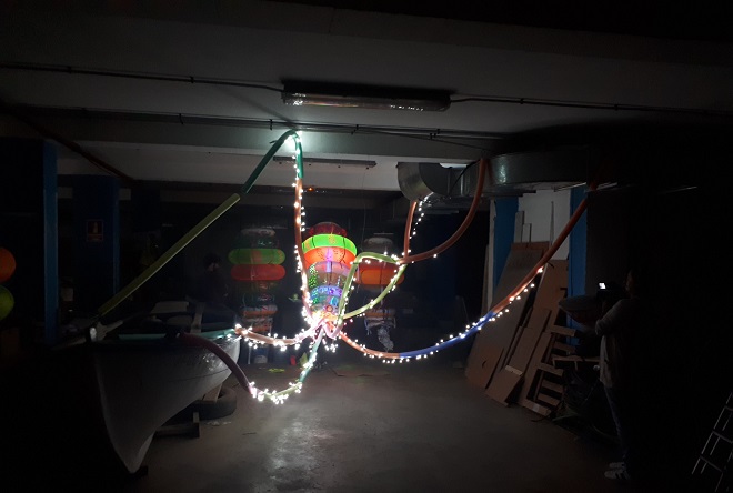 La colaboración ciudadana ha sido otra de las claves de este proyecto, tras desarrollarse con los vecinos un taller de elaboración de medusas a partir de botellas de plástico recicladas, y a través de la comunidad escolar, como el grupo de alumnos de segundo de Bachillerato del IES Corralejo que estuvo hoy colaborando en la decoración de las esculturas de los calamares en el taller donde se monta la iluminación.