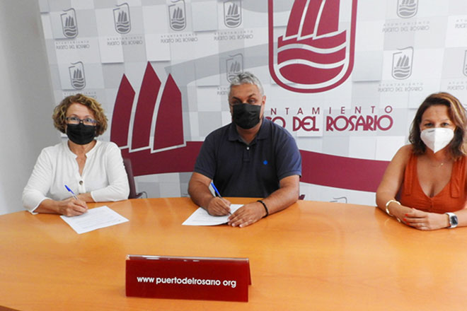 El alcalde capitalino, Juan Jiménez, la concejala de Contratación, Peña Armas, y los responsables de Librería Papelería Andrómeda S.L. e Imprenta Maxorata S.L., representados por Salomé Sánchez y Juan Ignacio Ruiz, han formalizado el contrato de los servicios de suministro de material de oficina y papelería, papelería de impresión, cartelería de impresión, cartelería y rotulación; y mobiliario de oficina para el Ayuntamiento de Puerto del Rosario.