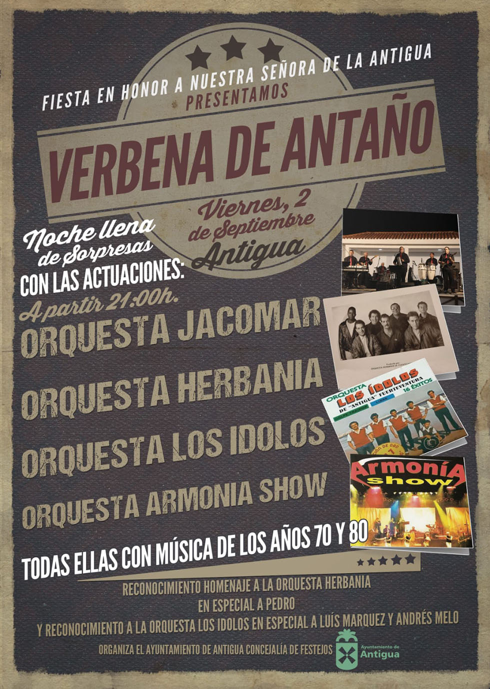 Las Fiestas en Honor a Nuestra Señora de La Antigua ofrecen un viaje al pasado con la Verbena Años 70 y 80 en la que más de treinta años después, vuelven a verse juntas sobre el escenario principal de Antigua, las orquestas Jacomar, Herbania, Los Ídolos y Armonía Show, este viernes 2 de septiembre a partir de las 22.00 horas.