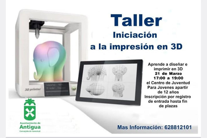 El Ayuntamiento de Antigua desde la concejalía de Juventud organiza el Taller de Iniciación a la impresión en 3D dirigido a los jóvenes mayores de 12 años con inquietudes en programas de diseño orientados a su reproducción con la última tecnología y material para impresión en tres dimensiones.