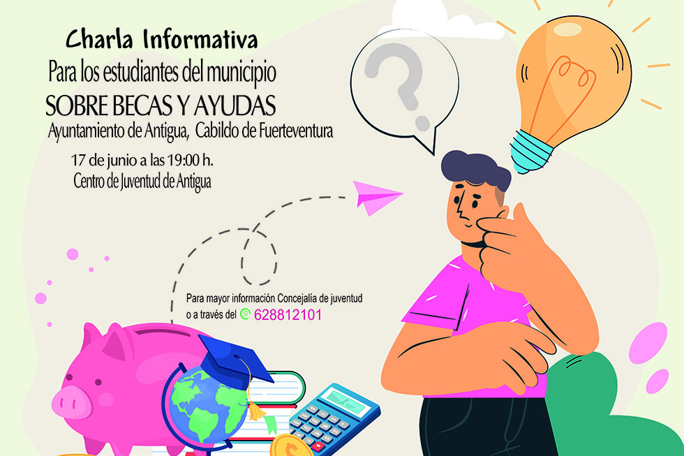 El Ayuntamiento de Antigua desde la concejalía de Juventud organiza una charla informativa sobre becas y ayudas que disponen los jóvenes en la isla y en el municipio, con tal fin, explica el alcalde, Matías Peña, “invitamos a participar al consejero de Educación y Juventud, Adargoma Hernández y técnicos insulares y municipales de las áreas competentes”.