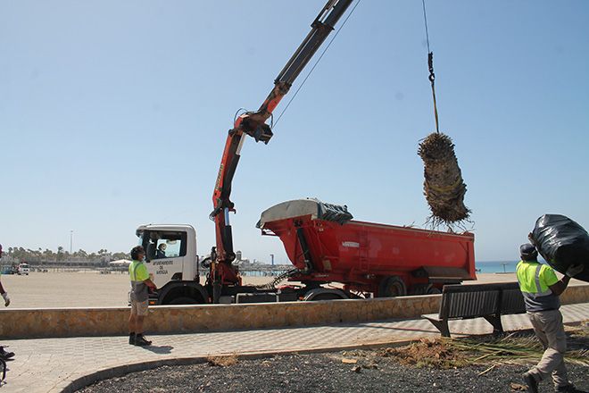 El Ayuntamiento de Antigua desde la concejalía de Parques y Jardines ha procedido a la retirada de las palmeras rotas o muertas en las zonas ajardinadas colindante con el paseo marítimo de El Castillo.