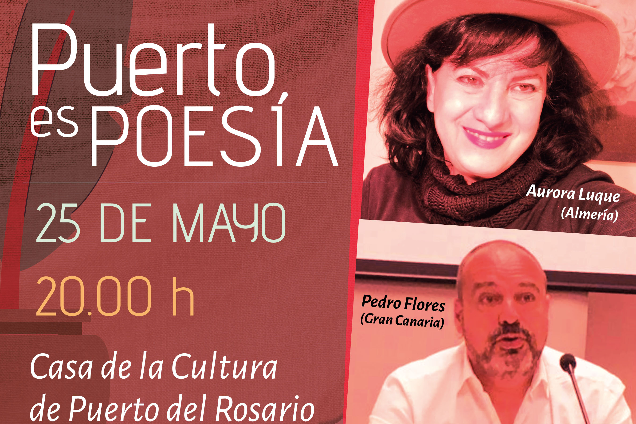 La Premio Nacional de Poesía 2022, Aurora Luque, y el Premio Internacional de Poesía Miguel Hernández: Pedro Flores, cierran este jueves, 25 de mayo, la octava edición del Festival 'Puerto es Poesía', promovido por la Concejalía de Cultura del Ayuntamiento de Puerto del Rosario. Será a las 20.00 horas en la Casa de la Cultura.