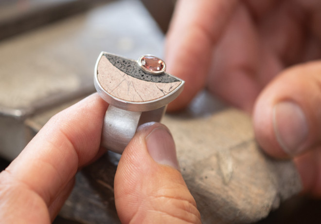 Como orfebre y joyero crea piezas que se producen en pequeñas series inspiradas en la naturaleza o en los materiales. “La inspiración la podemos coger de todos lados. Fuerteventura es una tierra de colorido diverso. Predominan los apagados en la tierra y en el mar más intensos. Pero la motivación que inspira las obras procede tanto de su experiencia creativa anterior en Suiza, como de la estancia en la Maxorata, como de sus viajes y, por qué no, también de internet.