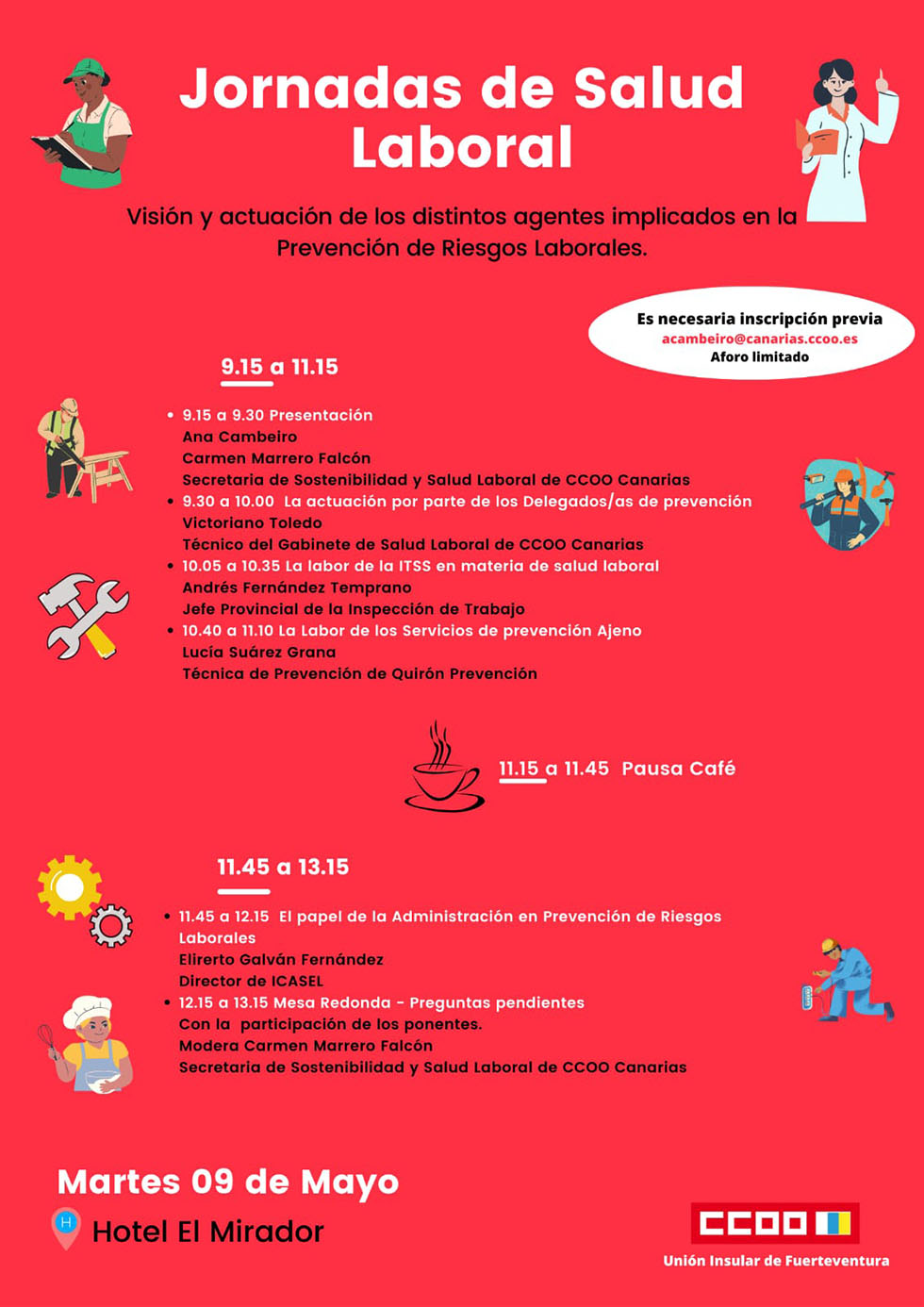 Con motivo del Día Mundial de la Seguridad y la Salud en el Trabajo, Comisiones Obreras Fuerteventura organiza el próximo 9 de mayo una jornada bajo el título “Visión y actuación de los distintos agentes implicados en la prevención de los riesgo laboral” con la participación la Inspección de Trabajo, ICASEL (Instituto Canario de Salud Laboral) , Quirón Prevención y el Gabinete de PRL de CCOO Canarias. Estas jornadas se engloban en torno a los objetivos de la Estrategia canaria por la seguridad y la salud laboral 2023-2027.