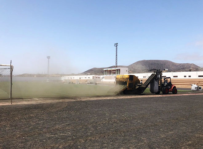 Este lunes dieron comienzo las obras de renovación del césped artificial en el Estadio Vicente Carreño de Corralejo, que será sustituido por una superficie de última generación. El nuevo césped cuenta con la garantía 'FIFA Quality Pro', la misma que se requiere en los campos donde se practica fútbol profesional, como la Segunda División.