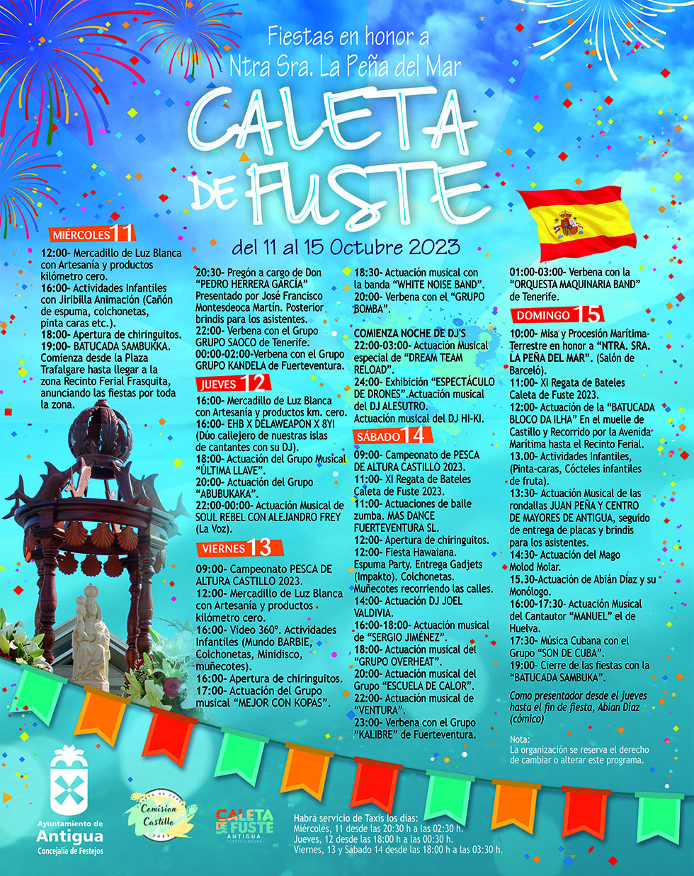 Desde este miércoles 11 y hasta el domingo 15, un amplio programa con las Batucadas Sambukka y Bloco Da Ilha, fiestas infantiles, masterclass de Zumba, verbenas con Saoko y Orquesta Maquinaria Band, ambas de Tenerife, además de Kandela y Grupo Bomba de Fuerteventura, y los conciertos de Escuela de Calor, Sergio Jiménez, la banda White noise Band, Manuel el de Huelva, Última Llave y la música cubana de Son de Cuba, entre algunos de los momentos que nos ofrece un cartel organizado por la concejalía de Festejos del Ayuntamiento de Antigua y la Comisión de Fiestas de Caleta de Fuste.