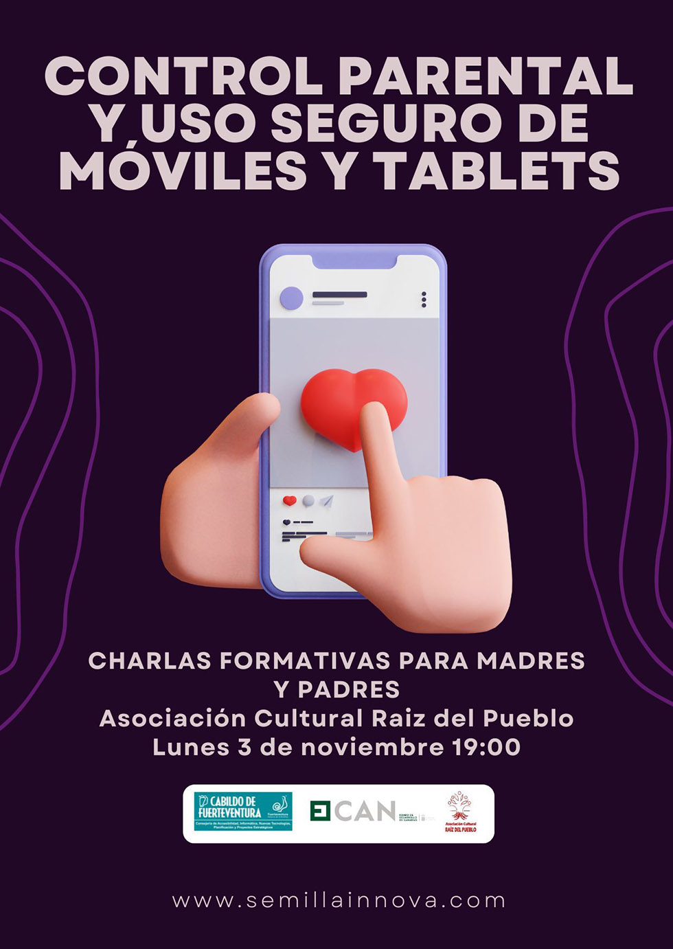 Como parte de este proyecto, el lunes 3 de noviembre a las 19.00 horas, en la sede de la Asociación Cultural Raíz del Pueblo, se celebrará una nueva charla formativa abierta a todas las madres y padres interesados en participar y ampliar sus conocimientos sobre el control parental y el uso seguro de móviles y tablets.