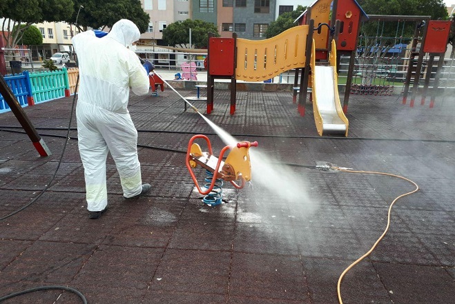 En este sentido, según informa el Departamento de Servicios del Ayuntamiento de Puerto del Rosario, la desinfección de los colegios de Infantil y Primaria del municipio, de competencia municipal en cuanto a su limpieza y mantenimiento, fueron considerados espacios especialmente sensibles, con lo cual se procedía a su desinfección en los primeros días del estado de alarma. De igual modo, se procedía a la limpieza y desinfección de otras zonas y enclaves como parques infantiles, acceso de urgencias del Hospital, paradas de guaguas y taxis o solares de la capital.