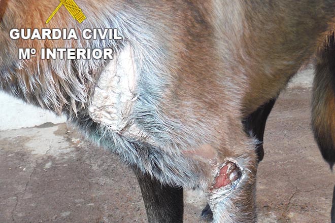 Por todo ello, la Guardia Civil requirió al posteriormente detenido que le mostrara al animal, pudiendo advertir que, aparte de no haber obtenido asistencia sanitaria para la cura de las graves lesiones presentadas, no tenía cartilla de vacunación. Posteriormente, el animal fue trasladado a centro veterinario para urgente intervención quirúrgica y gestionar su posterior adopción.