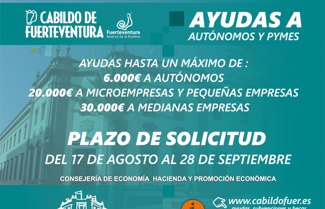 El Cabildo de Fuerteventura, a través de la consejería de Promoción Económica que dirige Lola García, abre el próximo martes, día 17 de agosto, el plazo para solicitar las ayudas que dirige a autónomos y pymes de la Isla, con el objetivo de mantener y consolidar el tejido productivo insular.