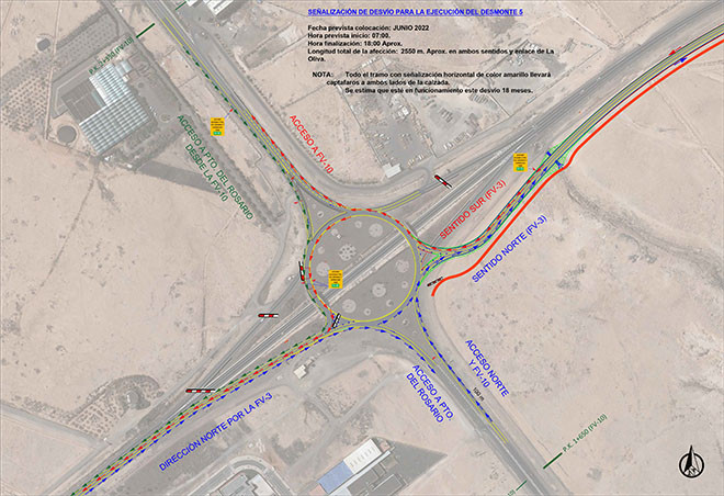 Con motivo de los trabajos que la Consejería de Obras Públicas, Transportes y Vivienda del Gobierno de Canarias está ejecutando en el tramo de la carretera de La Caldereta-Puerto del Rosario-Aeropuerto, incluido en el eje Norte-Sur de Fuerteventura, este jueves a partir de las 11.00 horas se procederá a llevar a cabo el desvío del tráfico necesario para la culminación de los trabajos, que se llevarán a cabo en el tramo comprendido entre los kilómetros 3,6 y 6 de la carretera FV-3 que afecta a la capital de la isla.