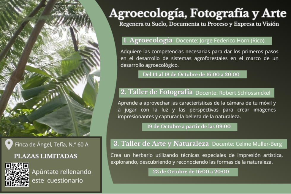 La asociación GDR MAxorata, en colaboración con la Consejería de Agricultura, Ganadería y Pesca del Cabildo de Fuerteventura, organiza el curso 'Agroecología, fotografía y arte. Regenera tu suelo, documenta tu proceso y expresa tu visión'. Esta formación, que se desarrollará del 14 al 23 de octubre en la Huerta de Ángel, en Tefía, tiene como objetivo proporcionar herramientas para regenerar el paisaje de Fuerteventura mediante la creación de ecosistemas productivos.