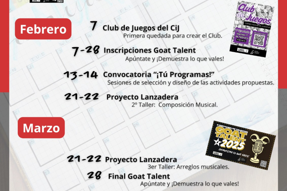 Asimismo, el Club de Juegos es un espacio dedicado a los aficionados a los juegos de mesa, cuya primera quedada está programada para el 7 de febrero a las 17:00 horas. Próximamente, también se abrirá el proceso de inscripción para el certamen de talentos Goat Talent 2025, continuando con el éxito de su edición anterior. Además, el encuentro de cultura urbana CiJ Hop regresará en junio, ofreciendo actividades de hip hop, graffiti, baile y otras expresiones urbanas.