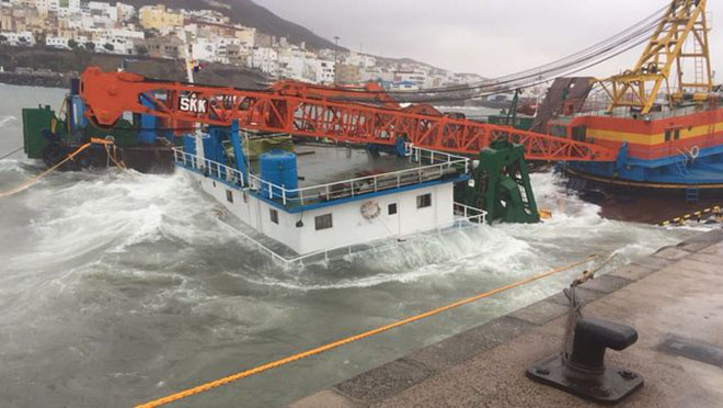 La gabarra hundida este miércoles en el Muelle de Gran Tarajal, en Tuineje, está doblemente anclada al fondo y no presenta ningún escape de vertidos, según ha informado el Gobierno de Canarias.