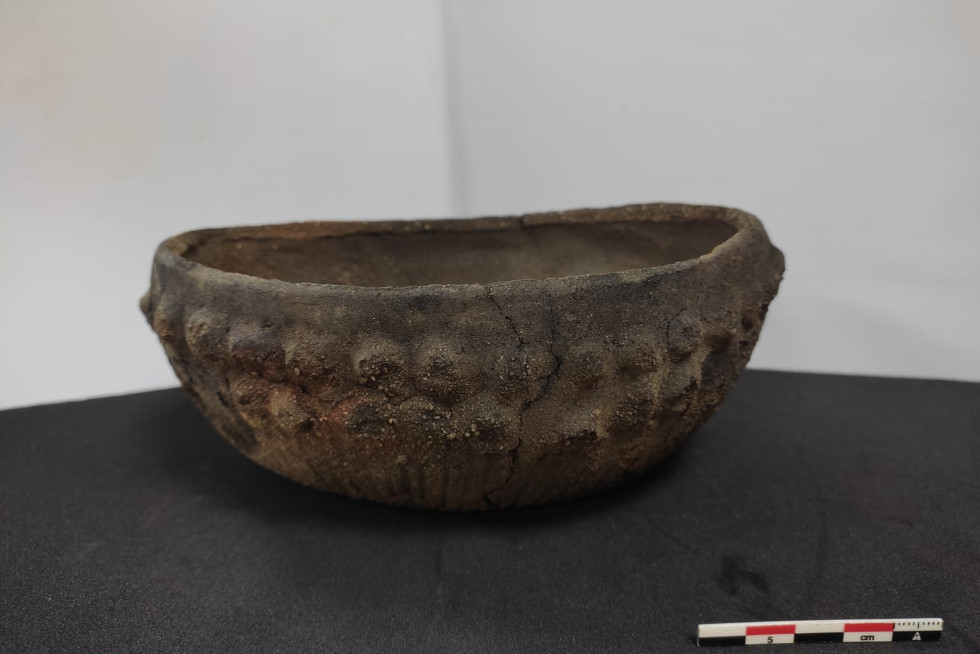 De fondo plano y forma ovalada, destaca por su abundante decoración, presentando en su parte superior dos filas de pequeñas protuberancias que rodean totalmente el cuerpo de la vasija. Presenta además surcos verticales hasta la base de la cerámica, elemento muy característico de la decoración del pueblo maho.