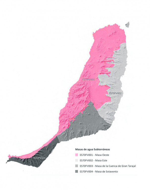 El Plan identifica cinco masas de agua superficial costera natural, una masa de agua superficial costera muy modificada, que es la costa de Puerto del Rosario, y cuatro masas de aguas subterráneas. Divide la costa en cinco zonas. Una sería la parte de las aguas profundas que rodean a la Isla, y el resto están entre Caleta del Espino y Punta Entallada, Punta Jandía y Punta del Lago, Punta Entallada y Punta Jandía, y finalmente entre Punta del Lago y Caleta del Espino. Las aguas subterráneas se dividen en la Masa Oeste, Masa Este, Masa de la Cuenca de Gran Tarajal y Masa de Sotavento de Jandía.