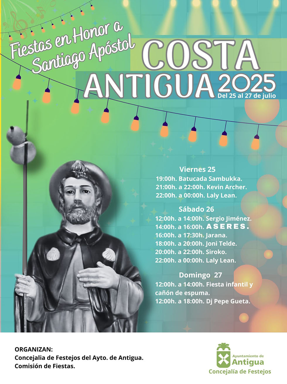 El Ayuntamiento de Antigua desde la concejalía de Festejos avisa del comienzo de las Fiestas de Costa de Antigua desde este viernes 25 de julio a las 19.00 horas, despertando las calles al ritmo de la percusión de la Batucada Sambukka, anunciando un programa, hasta el domingo 27 por la tarde, de actuaciones musicales, conciertos y refrescante fiesta infantil.