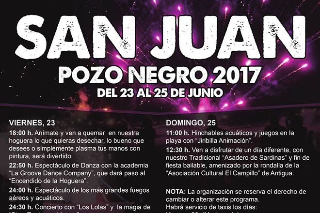 Tras la quema de la gran hoguera de San Juan en Pozo Negro, precedida de la actuación de baile de la academia Grove Dance, vecinos y visitantes podrán disfrutar sentados en la playa, de los fuegos acuáticos que iluminarán completamente cielo y mar.