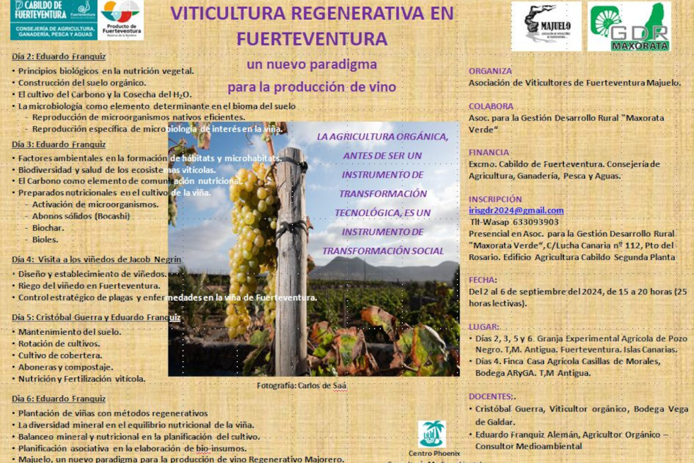 La isla de Fuerteventura acogerá el taller práctico de agricultura regenerativa centrado en la viticultura y un nuevo modelo para la producción de vino, que se llevará a cabo del 2 al 6 de septiembre de 2024. Este evento, organizado por la Asociación de Viticultores de Fuerteventura 'Majuelo', con la colaboración de la Asociación para la Gestión Desarrollo Rural 'Maxorata Verde', y financiado por la Consejería de Agricultura, Ganadería y Pesca del Cabildo de Fuerteventura, pretende ser un espacio de aprendizaje para viticultores y agricultores interesados en adoptar prácticas más sostenibles y respetuosas con el medio ambiente.