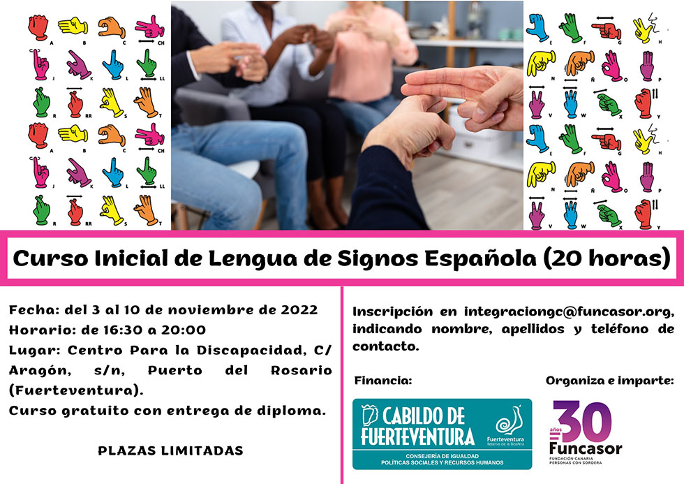 La Fundación Canaria para las Personas con Sordera y sus Familias-Funcasor ofrece un curso gratuito de iniciación a la lengua de signos española, gracias a la colaboración de la Consejería de Políticas Sociales del Cabildo de Fuerteventura. La formación se impartirá del 3 al 10 de noviembre en el Centro para la Discapacidad ubicado en Puerto del Rosario.