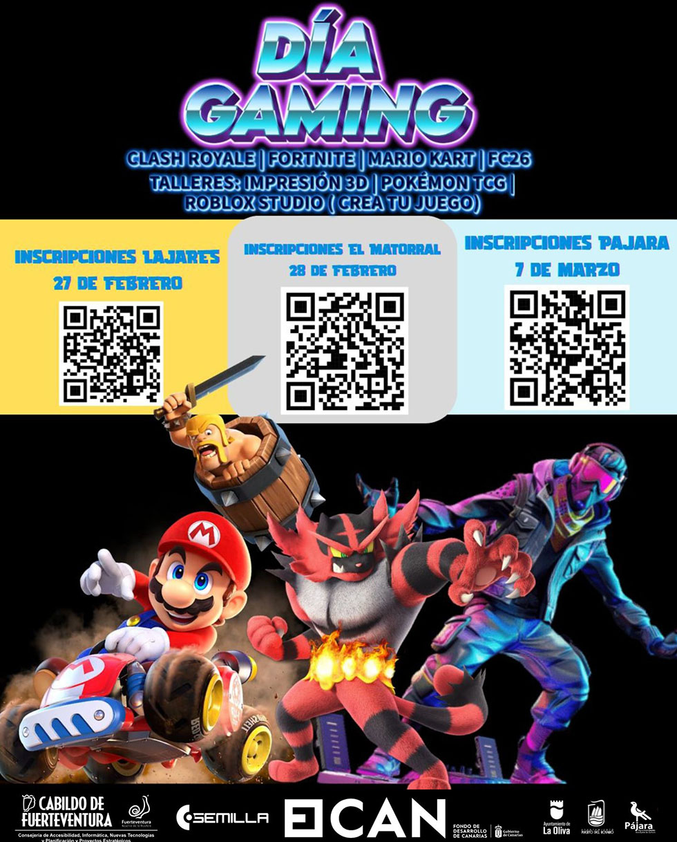 Como pistoletazo de salida, el Cabildo organiza varias jornadas "Día Gaming" abiertas al público juvenil, familias y personas aficionadas a los videojuegos. En estos encuentros se combinarán competiciones de Clash Royale, Fortnite, Mario Kart y FC26 con talleres de impresión 3D, Pokémon TCG y Roblox Studio para crear tu propio juego.