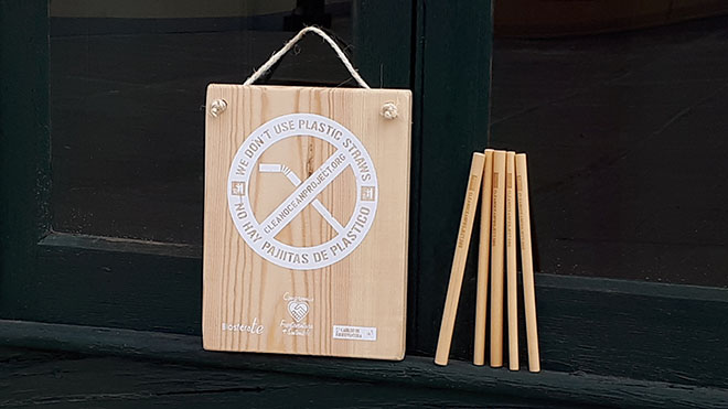 Además, cada establecimiento que ha firmado este contrato de compromiso con el medio ambiente ha recibido una placa de madera que informa a sus clientes de que no utilizan pajitas de plástico.