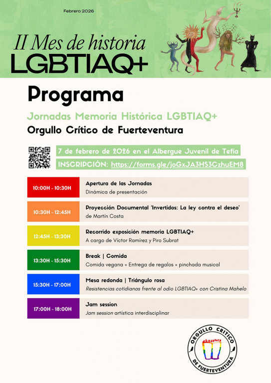 El activismo majorero se reúne este sábado 7 de febrero, en el Albergue Juvenil de Tefía, en una jornada gratuita organizada por Orgullo Crítico Fuerteventura, para concienciar, rememorar y poner en valor la historia del colectivo LGBTIAQ+.