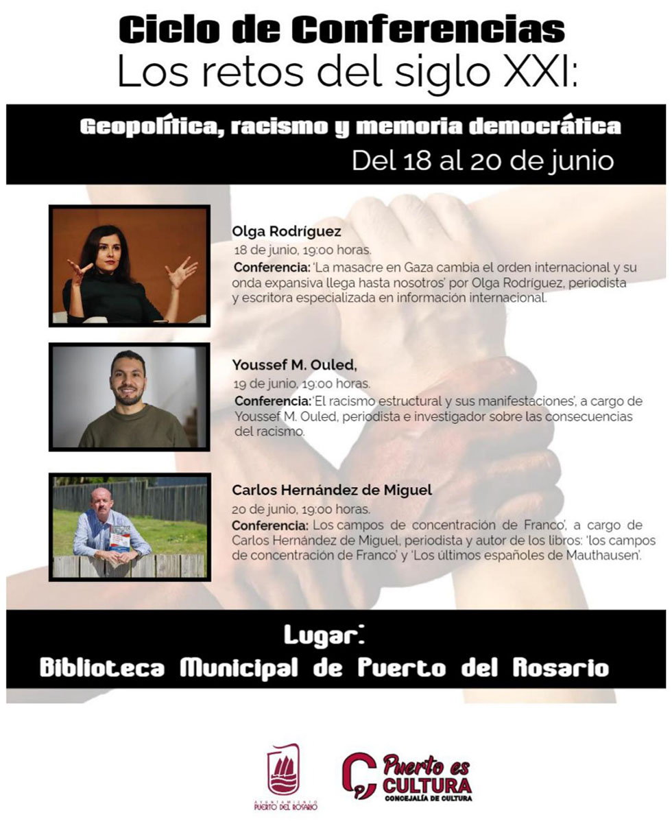 La Biblioteca Municipal de Puerto del Rosario acoge del 18 al 20 de junio las jornadas 'Los retos del siglo XXI: Geopolítica, racismo y memoria democrática'. Las charlas, organizadas por la Concejalía de Cultura que dirige Juan Jiménez, abordarán temas como el conflicto de Gaza, el racismo o los campos de concentración en España.