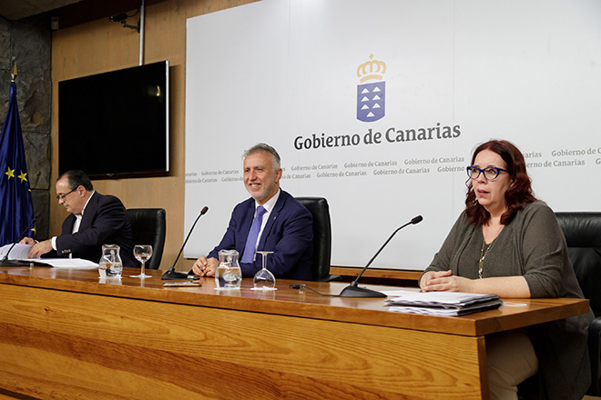 El presidente de Canarias, Ángel Víctor Torres, la consejera de Educación, Universidades, Cultura y Deportes, Manuela Armas, y el consejero de Sanidad, Blas Trujillo, han presentado en el Protocolo de prevención y organización para el desarrollo de la actividad educativa en centros de enseñanza no universitarios de Canarias para el curso académico 2020-2021. El Gobierno de Canarias ha elaborado un documento que plantea "una previsión que irá cambiando a medida que evolucione la pandemia desde el punto de vista epidemiológico", apuntó el presidente.