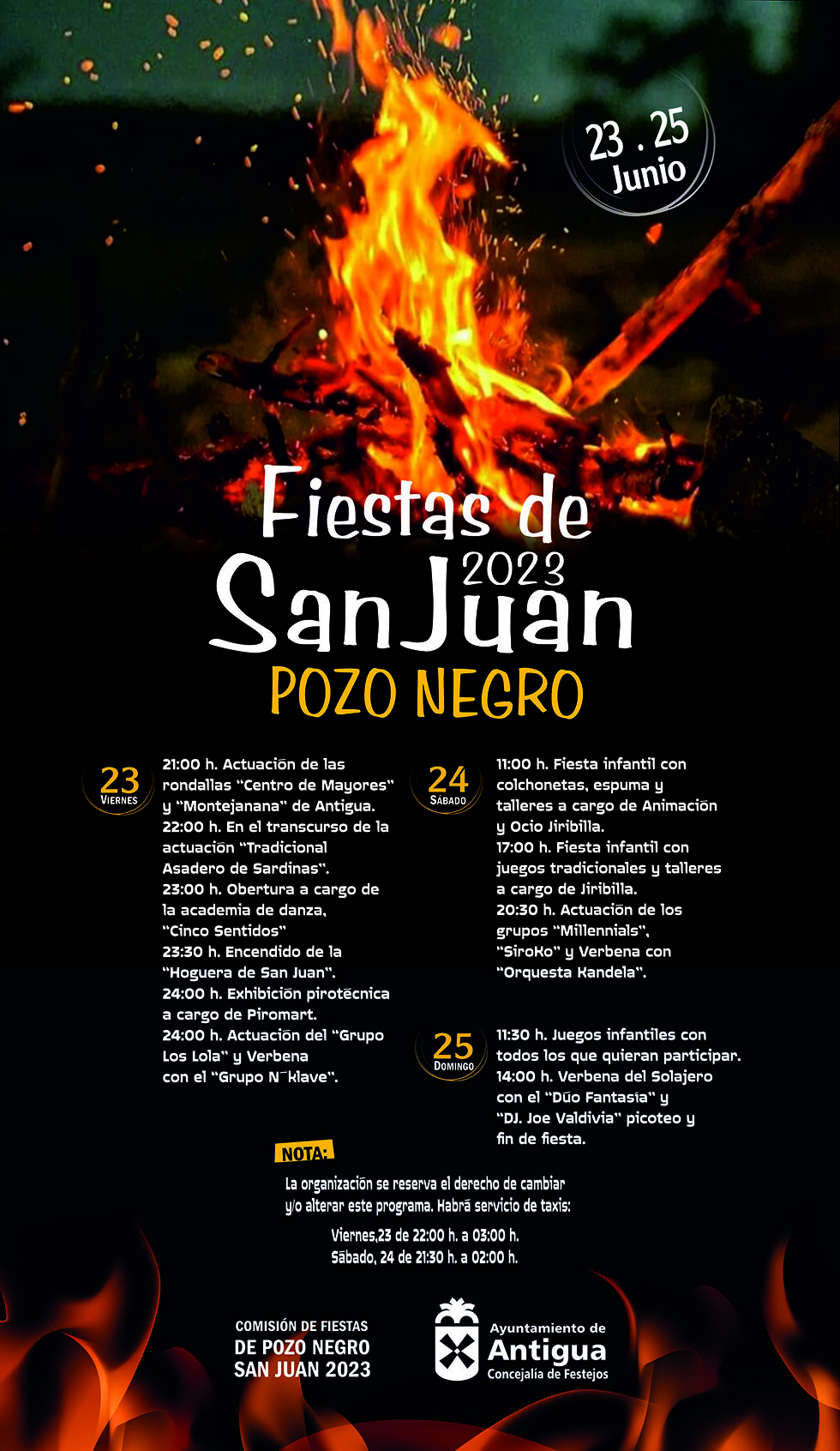 El Ayuntamiento de Antigua desde la concejalía de Festejos felicita las Fiestas de San Juan a los vecinos y vecinas de Pozo Negro y todo el Municipio, recordando ser responsables con las hogueras y hacer uso del servicio especial de taxis, que en Pozo Negro se dispondrá el viernes hasta las tres y el sábado hasta las dos de la madrugada.