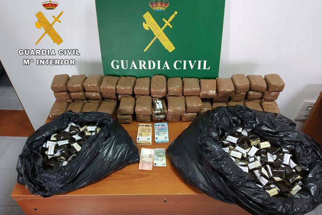 La Guardia Civil comprobó como en el maletero portaba dos cajas de cartón, una de la cuales contenía dos bolsas de color negro con 1154 tabletas de 25 gramos aproximadamente de hachís y una segunda caja con 60 paquetes de unos 500 gramos cada uno que en su totalidad alcanzaba los 60 kilogramos de dicha sustancia.
