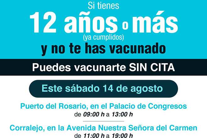 El Área de Salud de Fuerteventura, adscrita a la Consejería de Sanidad, organiza este sábado, día 14 de agosto, una nueva jornada de vacunación sin cita en Corralejo y en Puerto del Rosario para todas aquellas personas mayores de 12 años (ya cumplidos) que no hayan recibido ninguna dosis de la vacuna contra el Covid.