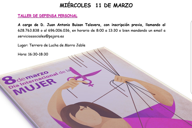 Las actividades comenzarán desde las 16:30 horas, en el Terrero de Lucha de Morro Jable, con un taller de defensa personal impartido por Juan Antonio Buisán. Para acudir será necesario inscribirse llamando a los teléfonos 628 76 38 38 o 696 00 60 36, o bien enviando un correo electrónico aserviciossociales@pajara.es Las plazas son limitadas.