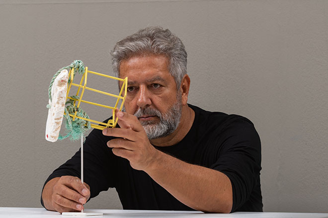 Juan Gopar habla como quien conoce, como quien ve y repara. La isla interpretada en su exposición, con más de 50 piezas de arte contemporáneo, no se construye desde el lenguaje lírico, ni desde la mirada del beatus ille. Su representación del territorio quiere ser un viaje a la autenticidad, pero también a la perspectiva crítica de una realidad dañina y evidente; el ojo del artista enlaza la belleza más desapercibida de los paisajes insulares con su enemigo más presente y en crecimiento: la proliferación de desechos plásticos y contaminación de la era del consumo. Se trata de una “reflexión en torno a la isla, no Fuerteventura en exclusiva, aunque Fuerteventura permite una mirada interesante por ser la más antigua y por esta perspectiva del paisaje y la lentitud”, explica. “Pensamos en el planeta, pero el tamaño de las islas, como territorio más frágil y pequeño, hace todo más entendible; la contaminación que en un continente se pierde al ojo humano, en las islas, por su escala, es perceptible: podemos tener un conocimiento más evidente, mucho más intuitivo, porque estamos muy cerca del problema”, señala.