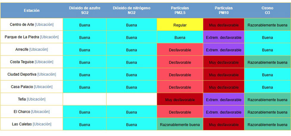 De acuerdo con las mediciones, las estaciones de Parque de la Piedra y El Charco, en Puerto del Rosario, y Tefía presentan los valores más preocupantes, al superar ampliamente los niveles recomendados para la concentración de partículas en suspensión PM10.